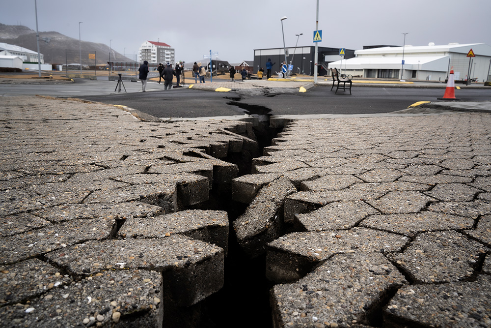 GRINDAVÍK, Iceland, November 2023. Cracks open in streets and town centre after an earthquake swarm forced the evacuation of the town.