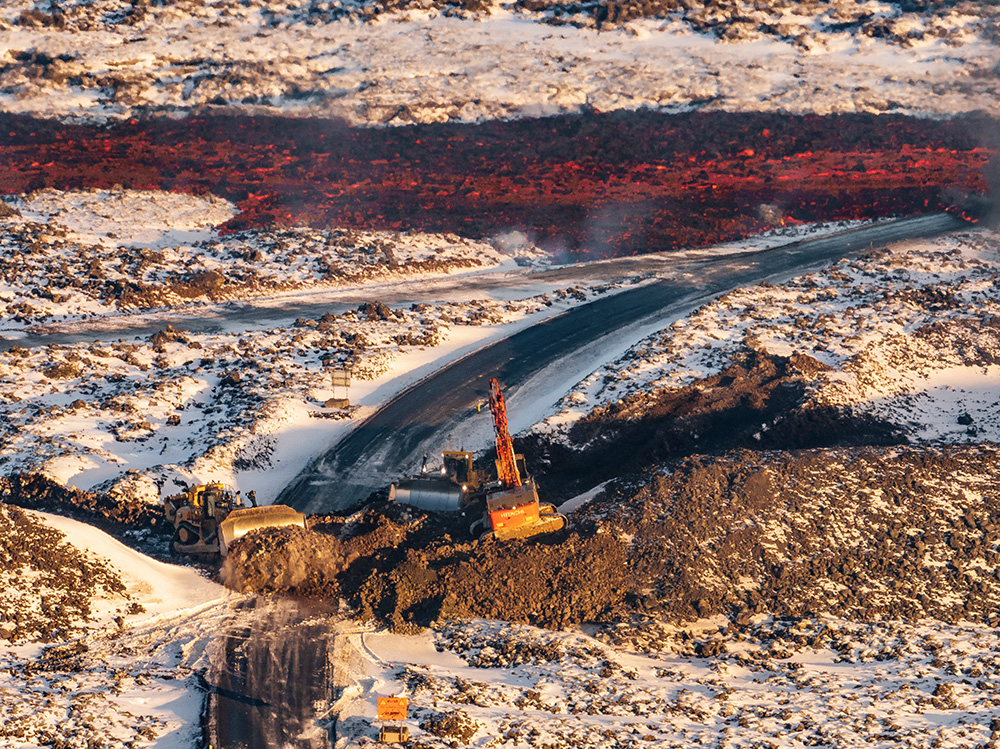 SVARTSENGI, Iceland, February 2024. Workers reinforce protective barriers as lava flows close to Caterpillar heavy machinery at the geothermal powerplant site.